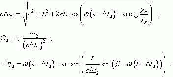 Для нахождения параметров второй (тяжёлой) массы m2 достаточно заменить R на r, m1 на m2 , а также α2 = ω(t – Δt2)– π. При этом получаем: