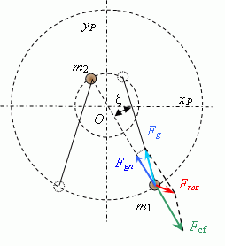 Рис. 11. Схема сил действующих на массу при взаимном вращении двух масс; Fg – гравитационная сила, Fgn – нормальная проекция гравитационной силы, Fсf – центробежная сила, Frez – результирующая сила