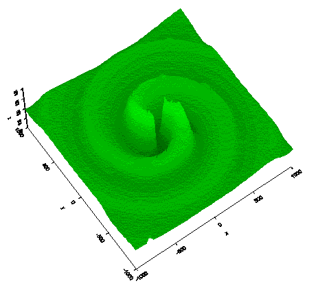 Рис. 3. «Диаграмма распределения динамического скалярного потенциала, возбуждаемого в окружающем пространстве астрономическим объектом с двумя центрами заряда, вращающимися по общей траектории в противофазе. Размер исследуемой области - 2000 световых лет, период вращения объекта по своей орбите Т = 900 лет» {12, с. 67}