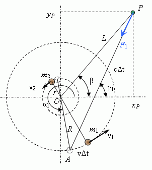 Введём, что отношение масс m1/m2 = n. Исходя из этого r/R = n, где О – центр масс. Также установим, что массы вращаются вокруг центра масс с угловой скоростью ω, а скорость распространения поля равна с.