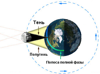 Рис. 11. «Тень от Луны в новолуние обычно падает мимо Земли, либо выше, либо ниже нашей планеты. Но по крайней мере два раза в год, когда Луна пересекает плоскость эклиптики (в т.н. узлах лунной орбиты) и некоторая часть тени Луны падает на поверхность Земли, в каком-то районе Земли можно наблюдать затмение Солнца» {13}.