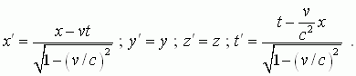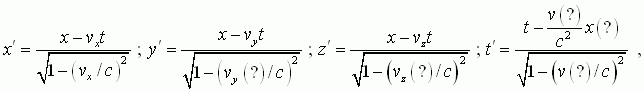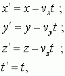 где (x, y, z, t) и (x', y', z', t) – параметры соответствующих ИСО, а (vx , vy , vz) скорость одной ИСО по отношению к другой.