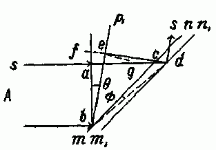 Рис. 1. «Допустим ab – это плоская волна, падающая на зеркало тn под углом в 45°. Если зеркало неподвижно, фронт волны после отражения займет положение ас.... Теперь предположим, что зеркало движется в направлении, которое составляет угол α со своей нормалью, со скоростью ω. Допустим, что V – это скорость света в эфире, который неподвижен, a cd – это увеличение расстояния, которое свет должен пройти, чтобы достичь d... Это направление будет отличаться от направления ba на угол θ» {2, с. 27}